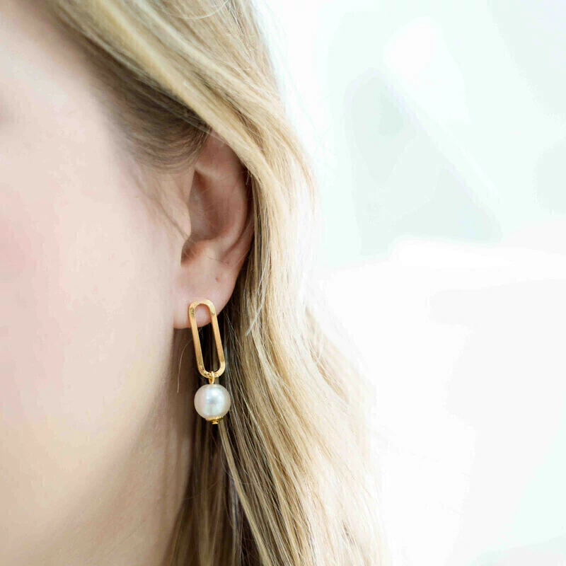 Brinco com detalhe oval vazado e pérola sintética pendurada banhado em ouro 18k proporciona um look clássico e estiloso.