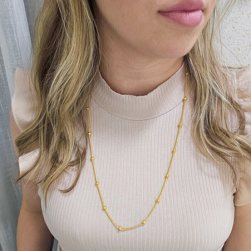 Se você busca uma semijoia que seja ao mesmo tempo minimalista e luxuosa, o Colar Esferas 60cm Banho Ouro 18k é a escolha ideal. Adquira agora e adicione um toque de glamour sofisticado ao seu visual.