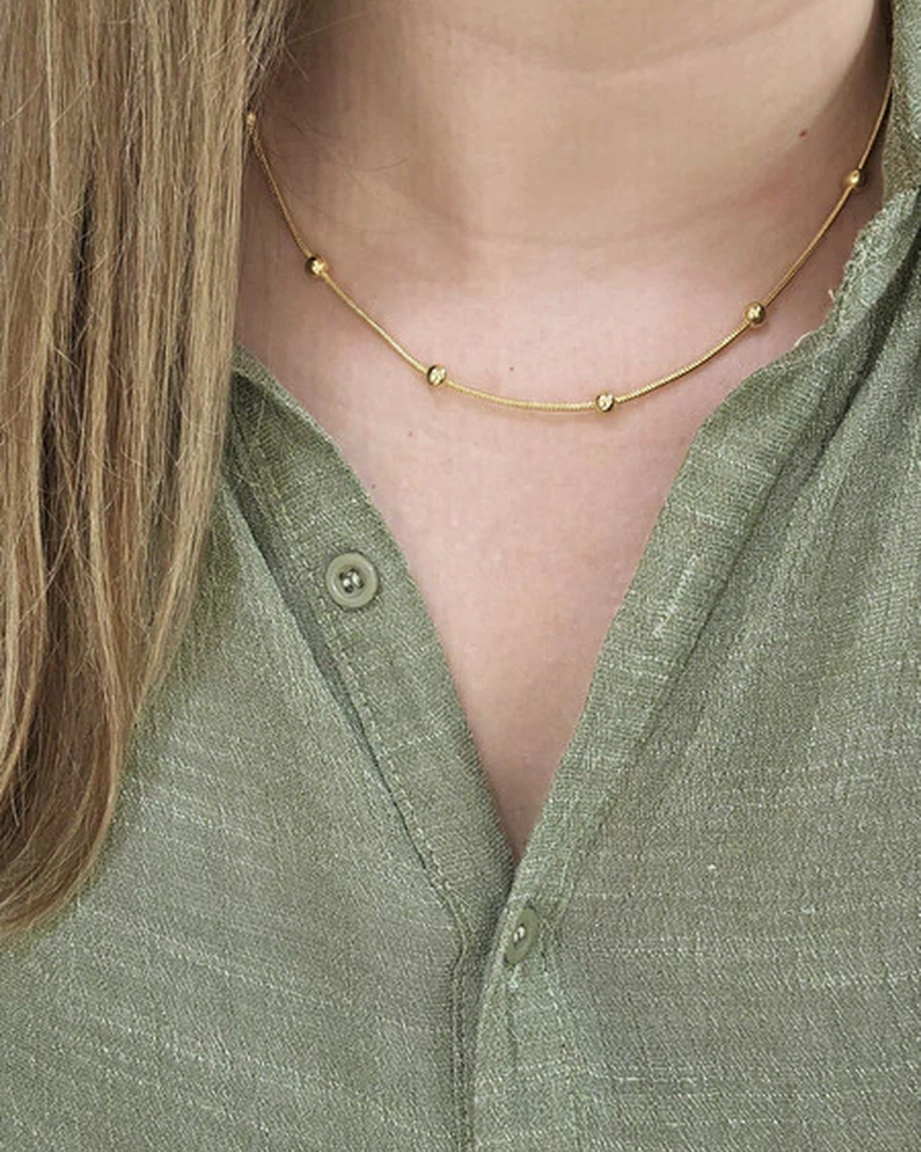 Moderno e atemporal, o colar fio alemão com bolinhas e banho em ouro 18k é uma peça versátil e elegante para o dia a dia. Seu design minimalista com delicados detalhes em bolinhas proporciona um toque de sofisticação, ideal para usar sozinho ou em combinações com outros colares.