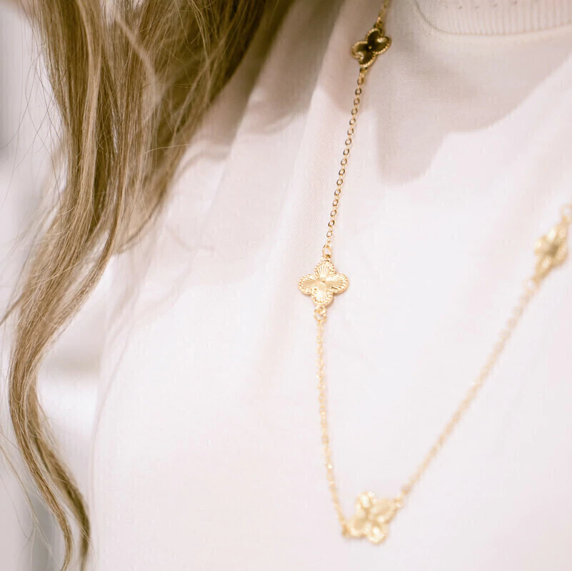 Com um design sofisticado e simbólico, o Colar Trevos Dourados Elo Português de 60CM com banho de ouro 18k é uma peça que combina elegância e boas energias.