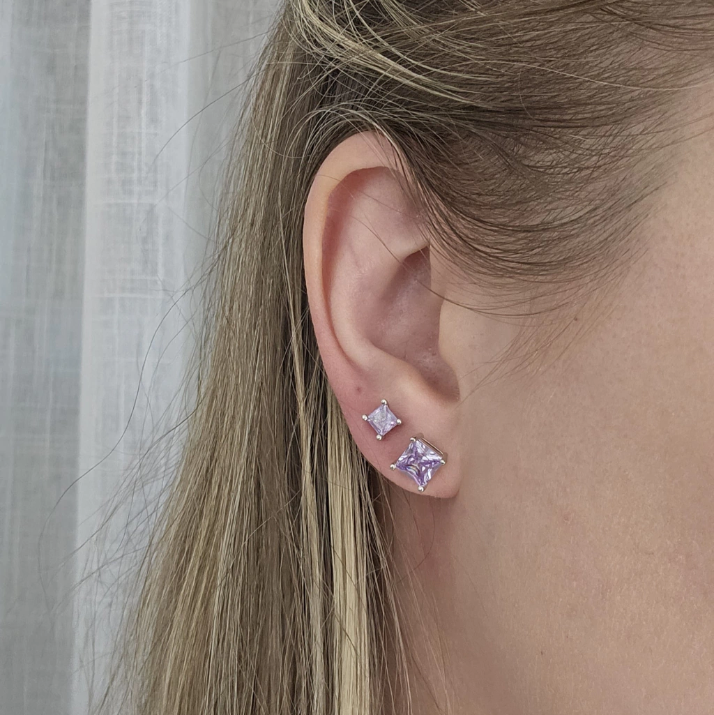 Duplinha de brincos no formato quadrado com zircônia lilás no banho de rodio branco proporciona um look clássico e estiloso.