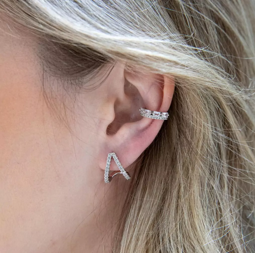 Piercing fake ajustável moderno ondulado com 2 fileiras cravejadas com microzircônias cristais banhado em ouro 18k.