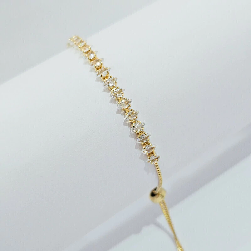 Com um design inovador e luxuoso, esta pulseira apresenta zircônias em formato navete, cuidadosamente cravadas para maximizar o brilho e o glamour.